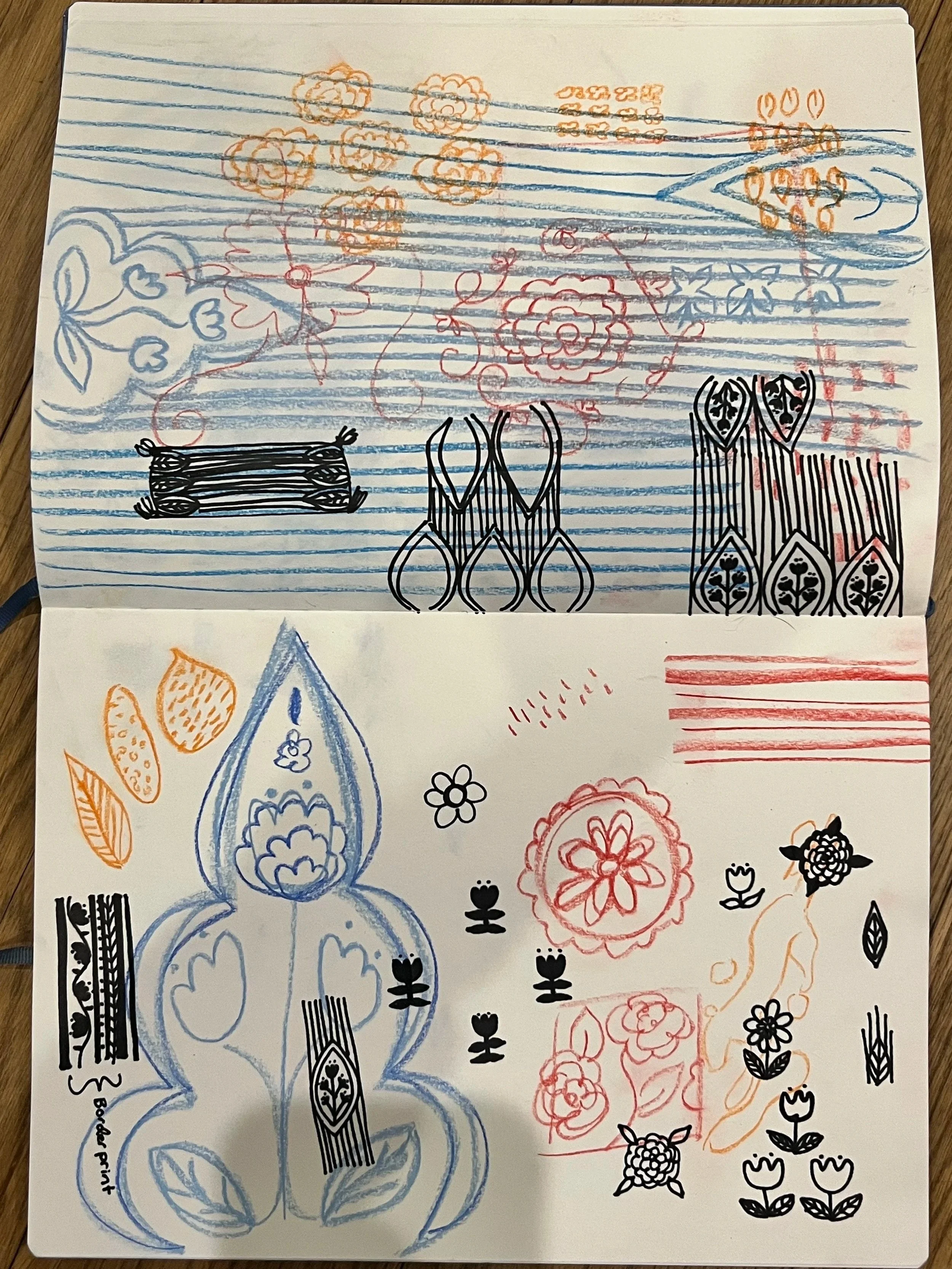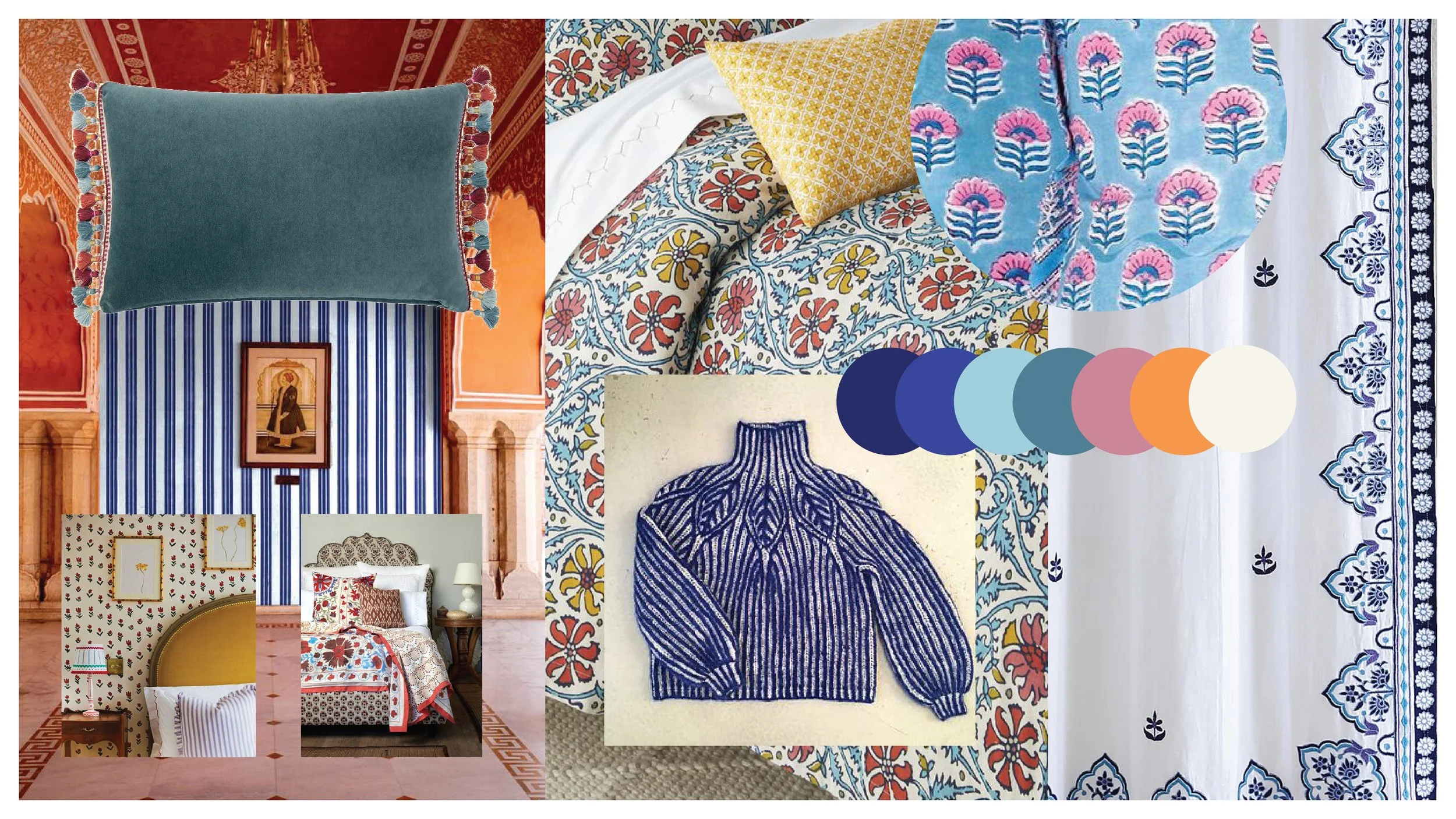 Below is the full collection, the moodboard, initial motif doodles, and a flat view of the individual components.